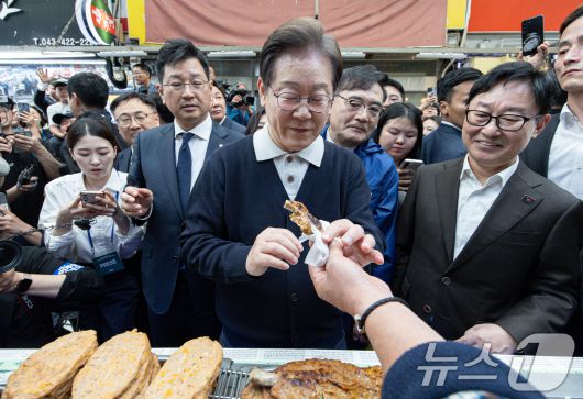 (단양=뉴스1) 이재명 기자 = '골목골목 경청투어 : 단양팔경편'에 나선 이재명 더불어민주당 대통령 후보가 4일 오전 충북 단양군 단양구경시장에서 떡갈비를 들어보이고 있다. 2025.5.4/뉴스12expulsion@news1.krCopyright ⓒ 뉴스1. All rights reserved. 무단 전재 및 재배포, AI학습 이용 금지.