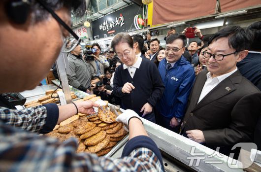 (단양=뉴스1) 이재명 기자 = '골목골목 경청투어 : 단양팔경편'에 나선 이재명 더불어민주당 대통령 후보가 4일 오전 충북 단양군 단양구경시장에서 상인과 대화를 하고 있다. 2025.5.4/뉴스12expulsion@news1.krCopyright ⓒ 뉴스1. All rights reserved. 무단 전재 및 재배포, AI학습 이용 금지.