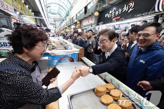 (단양=뉴스1) 이재명 기자 = '골목골목 경청투어 : 단양팔경편'에 나선 이재명 더불어민주당 대통령 후보가 4일 오전 충북 단양군 단양구경시장에서 상인과 인사를 나누고 있다. 2025.5.4/뉴스1