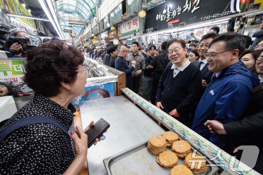 (단양=뉴스1) 이재명 기자 = '골목골목 경청투어 : 단양팔경편'에 나선 이재명 더불어민주당 대통령 후보가 4일 오전 충북 단양군 단양구경시장에서 상인과 인사를 나누고 있다. 2025.5.4/뉴스12expulsion@news1.krCopyright ⓒ 뉴스1. All rights reserved. 무단 전재 및 재배포, AI학습 이용 금지.