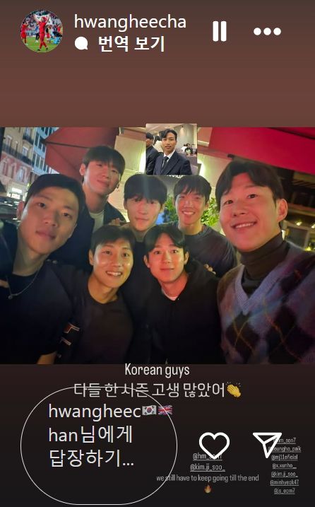 울버햄프턴 공격수 황희찬은 4일(한국시간) 자신의 인스타그램에 잉글랜드 무대에서 활약 중인 한국선수들과 함께 찍은 사진을 공개했다. “코리안 가이즈. 다들 한 시즌 고생 많았어”란 글과 박수 치는 이모티콘도 올렸다.