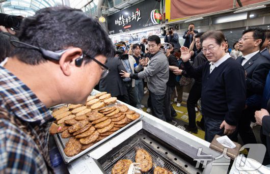(단양=뉴스1) 이재명 기자 = '골목골목 경청투어 : 단양팔경편'에 나선 이재명 더불어민주당 대통령 후보가 4일 오전 충북 단양군 단양구경시장에서 상인에게 인사하고 있다. 2025.5.4/뉴스12expulsion@news1.krCopyright ⓒ 뉴스1. All rights reserved. 무단 전재 및 재배포, AI학습 이용 금지.