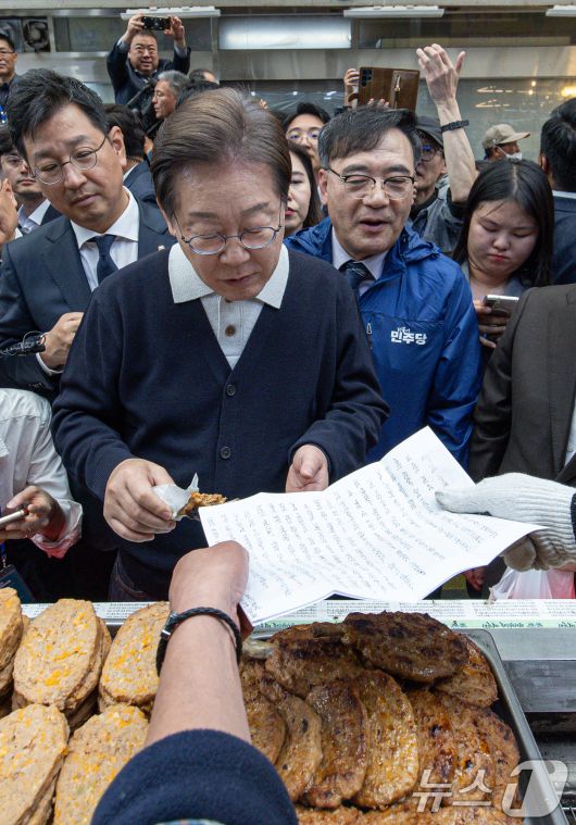(단양=뉴스1) 이재명 기자 = '골목골목 경청투어 : 단양팔경편'에 나선 이재명 더불어민주당 대통령 후보가 4일 오전 충북 단양군 단양구경시장에서 상인이 건네는 편지를 받고 있다. 2025.5.4/뉴스12expulsion@news1.krCopyright ⓒ 뉴스1. All rights reserved. 무단 전재 및 재배포, AI학습 이용 금지.
