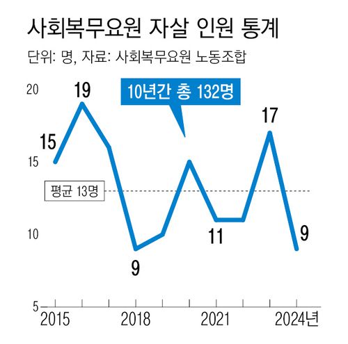 노조가 병무청에 정보공개청구를 해서 받은 자료를 보면, 지난 2015년부터 10년간 매년 평균 13명의 사회복무요원이 목숨을 끊은 것으로 나타났다. 10년간 사망한 사람은 132명에 달한다. 노조는 “지난해 5월 사회복무요원 350명을 대상으로 설문조사한 결과 괴롭힘을 겪은 사회복무요원이 64%였다”며 “지금도 노조에 월 평균 5~6건 정도 괴롭힘 상담 문의가 들어오는 것에 비해 상당히 적은 숫자”라고 밝혔다.