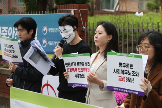 사회복무요원 노조 및 시민단체 회원들이 지난 4월 27일 서울 영등포구 서울지방병무청 앞에서 열린 ‘제3회 사회복무요원 노동자의 날’ 기자회견에서 사회복무제 개선을 촉구하고 있다. 연합뉴스 |