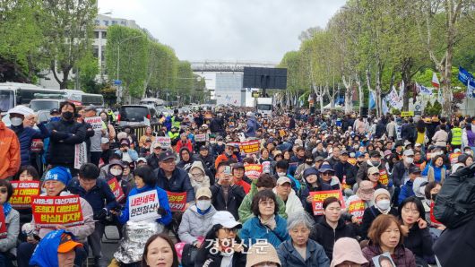 조희대 대법원장 탄핵을 요구하는 이들도 있었다. 박재성군(18)은 “고3인데 시간을 내서 나왔다”며 “정치 판결을 한 대법원장 탄핵이 필요하다”고 말했다. 박시현씨(44)도 “사건이 배당되기 전 재판 기록을 열람하지 않고서는 선고할 수 없는 기간”이라며 “선고가 무효”라고 주장했다.