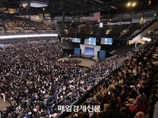 지난 3일(현지시간) 미국 네브래스카주 오마하 CHI헬스센터에서 열린 버크셔해서웨이 주주총회장에 전세계 4만명이 운집한 가운데 열리고 있다. <사진=윤원섭 특파원> |