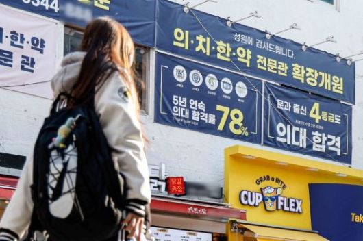 서울 강남구 대치동 학원가에서 한 학원 외벽에 의대 입시 관련 현수막이 붙어 있다. |
