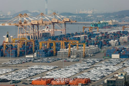 지난 2월16일 밝힌 가운데 16일 경기 평택항에 선적을 기다리고 있는 수출용 자동차가 줄지어 서 있다. 문재원 기자 |