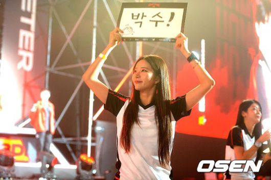 4077석 전석이 매진된 가운데 경기에 앞서 KT 인기 치어리더 김진아가 KT를 응원하기 위한 호응을 유도하고 있다. / scrapper@osen.cokr