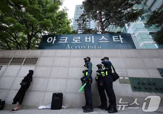 검찰이 30일 무속인 '건진법사' 전성배 씨의 청탁금지법 위반 혐의와 관련해 윤석열 전 대통령의 서초동 사저를 압수수색에 들어갔다. 검찰은 김건희 여사에게 선물로 전달된 다이아몬드 목걸이와 명품 가방 등의 의혹을 수사 중이다. 사진은 이날 오전 서울 서초구 아크로비스타 앞에 배치된 경찰 병력. 2025.4.30/뉴스1 ⓒ News1 김진환 기자 |