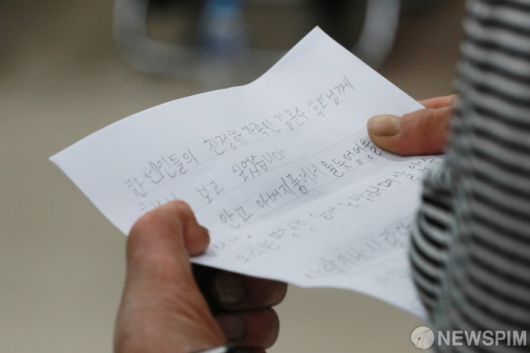 [포천=뉴스핌] 이형석 기자 = 김문수 국민의힘 대선후보가 4일 오후 경기 포천시 신평리 장자마을을 찾아 한센인들을 만났다. 이날 한 주민이 김 후보에게 직접 작성한 편지를 읽고 있다. 2025.05.04 leehs@newspim.com