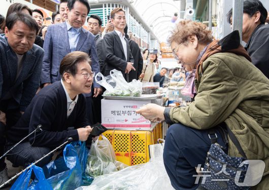 (영월=뉴스1) 이재명 기자 = '골목골목 경청투어 : 단양팔경편'에 나선 이재명 더불어민주당 대통령 후보가 4일 오후 강원 영월군 영월서부시장에서 상인과 대화를 하고 있다. 2025.5.4/뉴스12expulsion@news1.krCopyright ⓒ 뉴스1. All rights reserved. 무단 전재 및 재배포, AI학습 이용 금지.