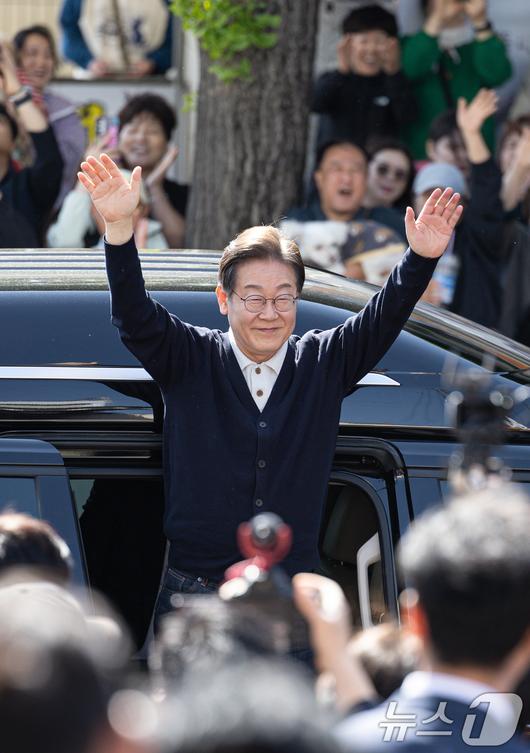 (영월=뉴스1) 이재명 기자 = '골목골목 경청투어 : 단양팔경편'에 나선 이재명 더불어민주당 대통령 후보가 4일 오후 강원 영월군 영월서부시장에 도착해 시민들을 향해 인사하고 있다. 2025.5.4/뉴스1