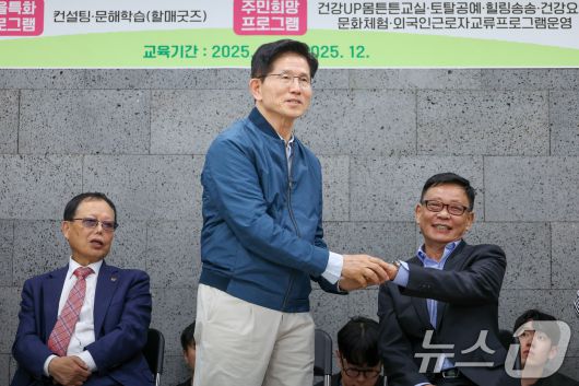 (포천=뉴스1) 안은나 기자 = 김문수 국민의힘 대통령 후보가 4일 오후 경기 포천시 한센인 정착마을인 장자마을 행복나눔터를 방문해 인사말을 하며 최종국 조합장의 손을 잡고 있다. 2025.5.4/뉴스1