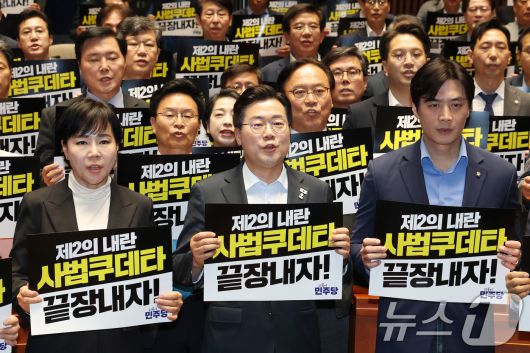 (서울=뉴스1) 심언기 한재준 기자 = 박찬대 더불어민주당 상임 총괄선거대책위원장은 4일 "우리가 가진 모든 권한과 능력, 가용 가능한 수단과 방법을 총동원해 이 싸움에 임해야 한다"고 대법원장 탄핵·특검 등 추진 불사 의지를 밝혔다.