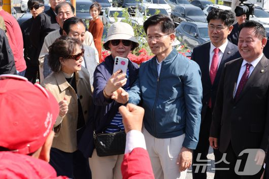 (포천=뉴스1) 안은나 기자 = 김문수 국민의힘 대통령 후보가 4일 오후 경기 포천시 한센인 정착마을인 장자마을 행복나눔터를 방문해 지지자와 셀카를 찍고 있다. 2025.5.4/뉴스1coinlocker@news1.krCopyright ⓒ 뉴스1. All rights reserved. 무단 전재 및 재배포, AI학습 이용 금지.