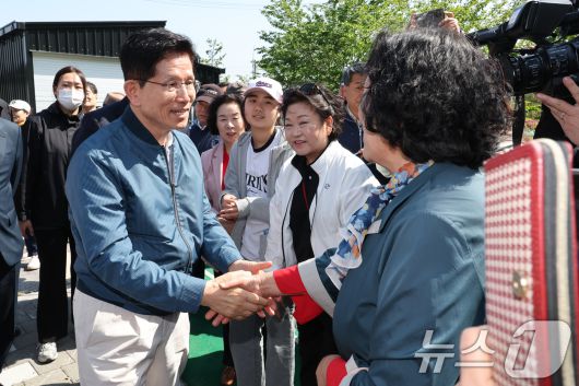 (포천=뉴스1) 안은나 기자 = 김문수 국민의힘 대통령 후보가 4일 오후 경기 포천시 한센인 정착마을인 장자마을 행복나눔터를 방문해 주민 및 지지자들과 인사를 나누고 있다. 2025.5.4/뉴스1coinlocker@news1.krCopyright ⓒ 뉴스1. All rights reserved. 무단 전재 및 재배포, AI학습 이용 금지.