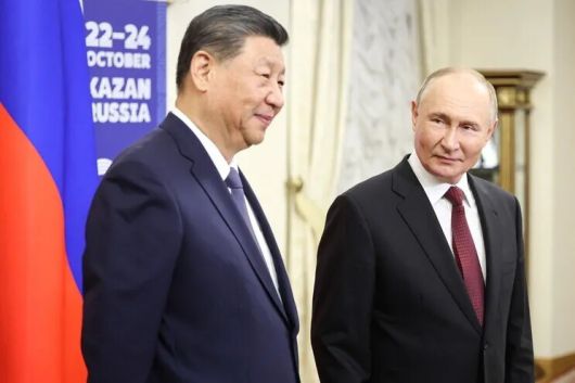 진핑(왼쪽) 중국 국가주석과 블라디미르 푸틴 러시아 대통령이 지난해 10월 22일 러시아 카잔에서 열린 브릭스 정상회의에서 만났다. 카잔/타스 연합뉴스 |