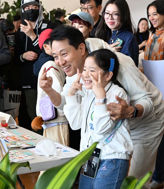 오세훈 서울시장이 4일 서울 중구 동대문디자인플라자(DDP)의 ‘DDP 봄 축제: 디자인 테마 파크’ 행사장을 찾은 어린이와 사진을 찍고 있다. 서울시 제공 |