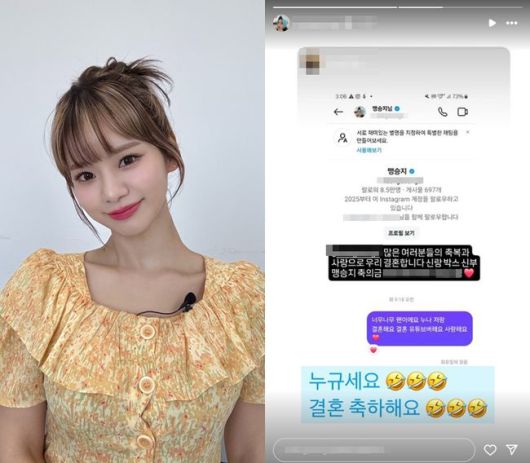 해당 메시지에는 한 누리꾼이 ‘많은 여러분들의 축복과 사랑으로 우리 결혼합니다’라는 문구와 함께 신부 이름에 ‘맹승지’를 적어 놨고, 축의금을 받을 계좌까지 기입했다. 맹승지는 터무니 없는 주장에 “누구세요”, “결혼 축하해요”라는 글과 황당한 표정의 이모티콘을 남기며 어이없다는 반응을 보였다.