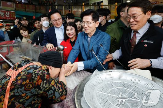 (의정부=뉴스1) 안은나 기자 = 김문수 국민의힘 대통령 후보가 4일 오후 경기 의정부시 제일시장을 방문해 상인과 악수하고 있다. 2025.5.4/뉴스1coinlocker@news1.krCopyright ⓒ 뉴스1. All rights reserved. 무단 전재 및 재배포, AI학습 이용 금지.