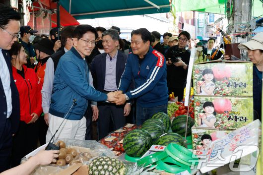 (의정부=뉴스1) 안은나 기자 = 김문수 국민의힘 대통령 후보가 4일 오후 경기 의정부시 제일시장을 방문해 상인과 악수하고 있다. 2025.5.4/뉴스1