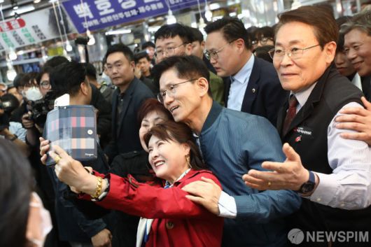 [의정부=뉴스핌] 이형석 기자 = 김문수 국민의힘 대선후보가 4일 오후 경기도 의정부 제일시장을 찾아 시민들과 기념촬영을 하고 있다. 2025.05.04 leehs@newspim.com