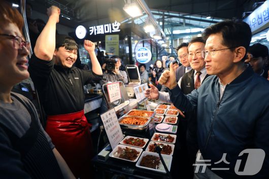 (의정부=뉴스1) 안은나 기자 = 김문수 국민의힘 대통령 후보가 4일 오후 경기 의정부시 제일시장을 찾아 알곤이찜을 시식한 뒤 엄지 손가락을 치켜들고 있다. (공동취재) 2025.5.4/뉴스1coinlocker@news1.krCopyright ⓒ 뉴스1. All rights reserved. 무단 전재 및 재배포, AI학습 이용 금지.