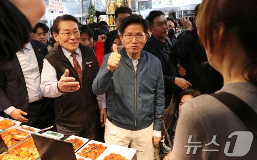 (의정부=뉴스1) 안은나 기자 = 김문수 국민의힘 대통령 후보가 4일 오후 경기 의정부시 제일시장을 찾아 알곤이찜을 시식한 뒤 엄지 손가락을 치켜들고 있다. (공동취재) 2025.5.4/뉴스1coinlocker@news1.krCopyright ⓒ 뉴스1. All rights reserved. 무단 전재 및 재배포, AI학습 이용 금지.