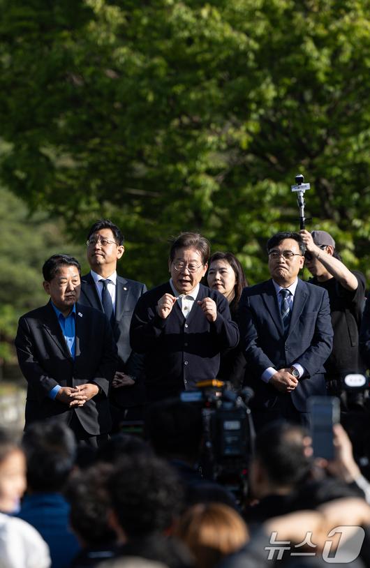 (제천=뉴스1) 이재명 기자 = '골목골목 경청투어 : 단양팔경편'에 나선 이재명 더불어민주당 대통령 후보가 4일 오후 충북 제천시 의림지에서 연설을 하고 있다. 2025.5.4/뉴스1