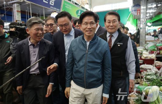 (의정부=뉴스1) 안은나 기자 = 김문수 국민의힘 대통령 후보가 4일 오후 경기 의정부시 제일시장을 방문해 상인 및 시민들과 인사하고 있다. (공동취재) 2025.5.4/뉴스1