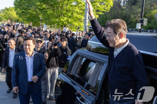 (제천=뉴스1) 이재명 기자 = '골목골목 경청투어 : 단양팔경편'에 나선 이재명 더불어민주당 대통령 후보가 4일 오후 충북 제천시 의림지에서 차량에 탑승한 후 인사하고 있다. 2025.5.4/뉴스12expulsion@news1.krCopyright ⓒ 뉴스1. All rights reserved. 무단 전재 및 재배포, AI학습 이용 금지.