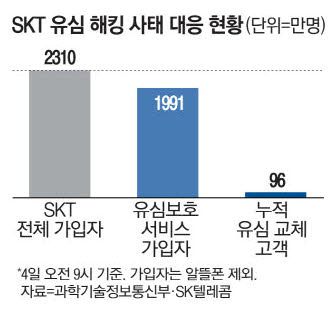 한편 김희섭 SK텔레콤 PR센터장은 4일 브리핑에서 "유심보호서비스는 자동 가입을 시작해 4일 오전 9시 기준 누적 1991만명이 가입했다"며 "오늘(4일)이 지나면 2000만명이 넘게 될 것"이라고 밝혔다. 유심 교체도 이날 오전 9시까지 6000명이 추가로 하면서 누적 유심 교체 고객이 96만2000명을 기록했다.
