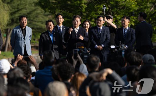 (제천=뉴스1) 이재명 기자 = '골목골목 경청투어 : 단양팔경편'에 나선 이재명 더불어민주당 대통령 후보가 4일 오후 충북 제천시 의림지에서 연설을 하고 있다. 2025.5.4/뉴스1