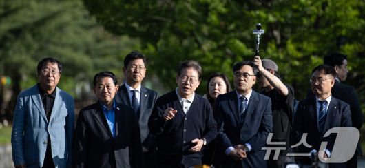 (제천=뉴스1) 이재명 기자 = '골목골목 경청투어 : 단양팔경편'에 나선 이재명 더불어민주당 대통령 후보가 4일 오후 충북 제천시 의림지에서 연설을 하고 있다. 2025.5.4/뉴스1