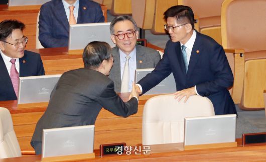 김문수 국민의힘 대선 후보가 지난해 9월4일 국회 본회의에서 한덕수 전 국무총리와 악수하고 있다. 박민규 선임기자 |