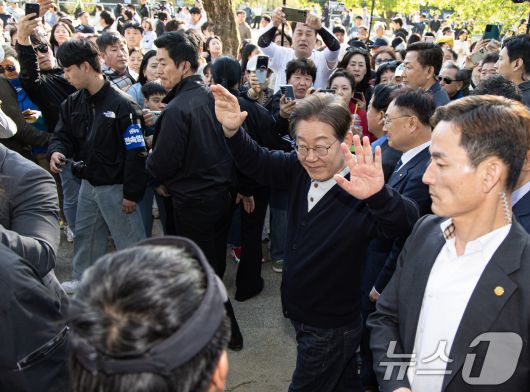 (제천=뉴스1) 이재명 기자 = '골목골목 경청투어 : 단양팔경편'에 나선 이재명 더불어민주당 대통령 후보가 4일 오후 충북 제천시 의림지에서 시민들과 인사를 하고 있다. 2025.5.4/뉴스1