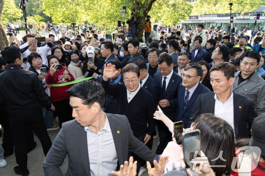 (제천=뉴스1) 이재명 기자 = '골목골목 경청투어 : 단양팔경편'에 나선 이재명 더불어민주당 대통령 후보가 4일 오후 충북 제천시 의림지에서 시민들과 인사를 하고 있다. 2025.5.4/뉴스1