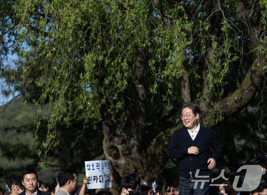 (제천=뉴스1) 이재명 기자 = '골목골목 경청투어 : 단양팔경편'에 나선 이재명 더불어민주당 대통령 후보가 4일 오후 충북 제천시 의림지에서 연설을 하기 위해 단상을 오르고 있다. 2025.5.4/뉴스1