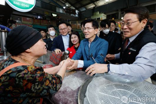 [의정부=뉴스핌] 이형석 기자 = 김문수 국민의힘 대통령 후보가 4일 오후 경기 의정부시 제일시장을 방문해 상인과 악수하고 있다. 2025.05.04 leehs@newspim.com