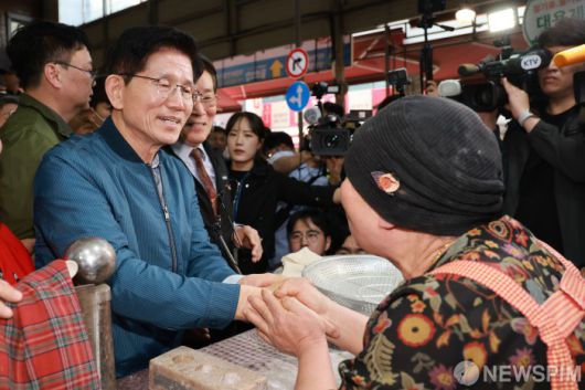[의정부=뉴스핌] 이형석 기자 = 김문수 국민의힘 대통령 후보가 4일 오후 경기 의정부시 제일시장을 방문해 상인과 인사를 나누고 있다. 2025.05.04 leehs@newspim.com