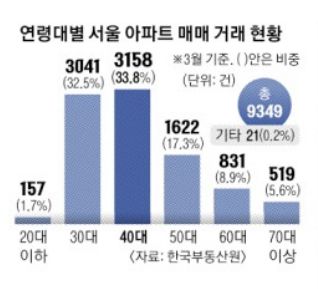 4일 한국부동산원에 따르면 지난 3월 매매 신고된 서울 아파트 9349건 가운데, 40대가 전체의 33.8%(3158건)를 매수해 연령대별 1위를 차지했다. 이는 30대의 32.5%(3041건)보다 높은 수치다.