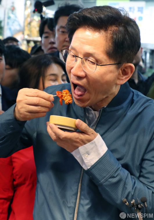 [의정부=뉴스핌] 이형석 기자 = 김문수 국민의힘 대통령 후보가 4일 오후 경기 의정부시 제일시장을 방문해 알곤이찜을 시식하고 있다. 2025.05.04 leehs@newspim.com