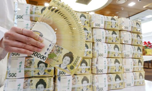서울 중구 하나은행에서 직원이 5만원권을 펼쳐 보이고 있다. 뉴스1 |