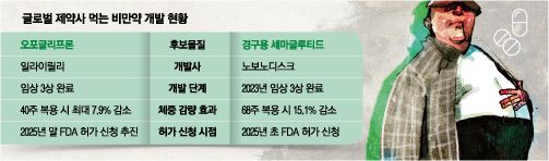 하루 한 번씩 약을 먹는 것만으로 살을 뺄 수 있을까. 멀게만 여겨졌던 경구용 비만약 시대가 임박했다. ‘먹는 비만 치료제 시대’를 열 것으로 기대를 모으는 주인공은 현재 비만 치료제 시장을 양분하고 있는 덴마크 노보노디스크와 미국 일라이릴리다. 이들 빅파마가 최근 나란히 경구제의 내년 출시 가능성을 내비치면서 관련 시장이 들썩이고 있다.