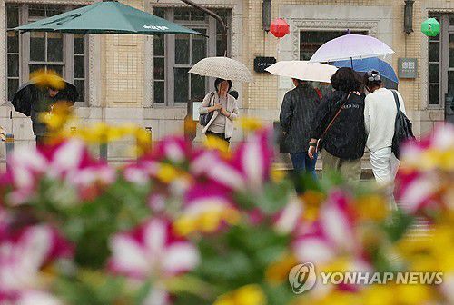 (서울=연합뉴스) 김도훈 기자 = 전국적으로 비가 내린 1일 서울 종로구 세종로사거리에 심어진 화단 뒤로 우산을 쓴 시민들이 길을 지나고 있다. 2025.5.1 superdoo82@yna.co.kr