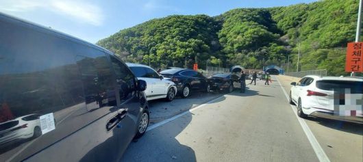 [완주=뉴시스]최정규 기자 = 4일 오후 3시 23분께 전북 완주군 상관면 순천완주고속도로 상행선 임실IC에서 상관IC방향 12㎞ 지점에서 8중 추돌사고가 발생했다.