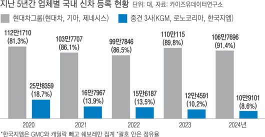 반면 현대차그룹은 국산 승용차 시장 점유율을 2020년 81.3%에서 지난해 91.4%까지 끌어올렸다. 지난해 판매량은 106만7696대로 집계됐다.