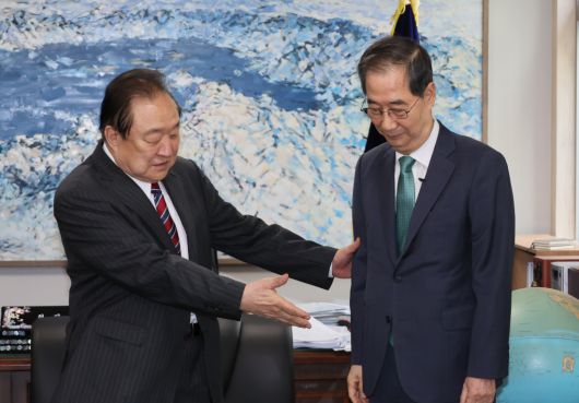 정대철 헌정회장 만난 한 한덕수 전 국무총리(오른쪽)가 지난 3일 국회 헌정기념관을 찾아 정대철 헌정회장을 만나고 있다. 연합뉴스 |